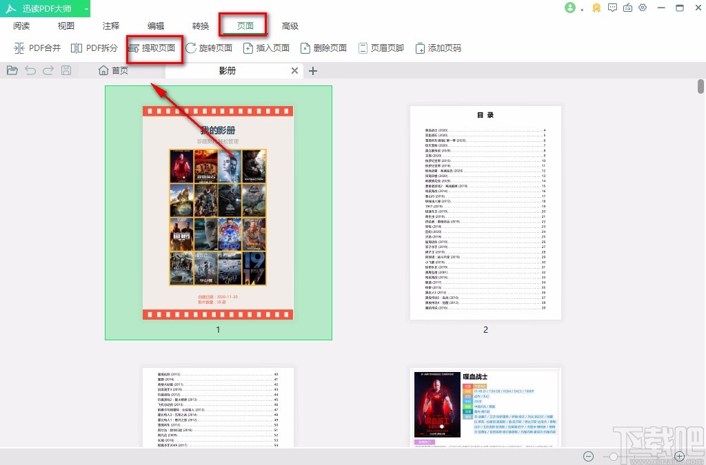 3.将PDF文件添加到软件后,我们在界面上方找到“页面”选项并点击,之后在其下方选择“提取页面”选项。
