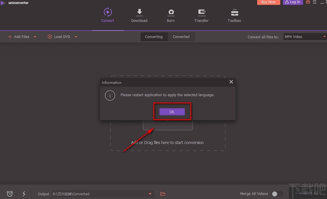 6.随后界面上会弹出一个提示框,提示我们需要重启软件才能使语言设置生效,这时候点击框中的“OK”按钮即可。