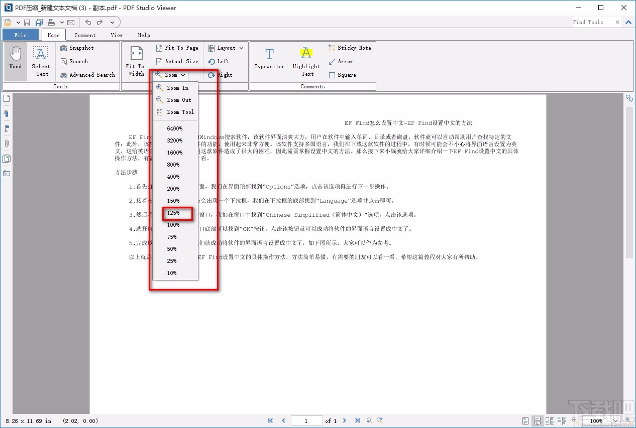 4.接着在Zoom选项下方会出现一个下拉框,在下拉框中可以看到很多缩放比例选项,我们根据自己的需要进行选择即可;比如小编选择125%。