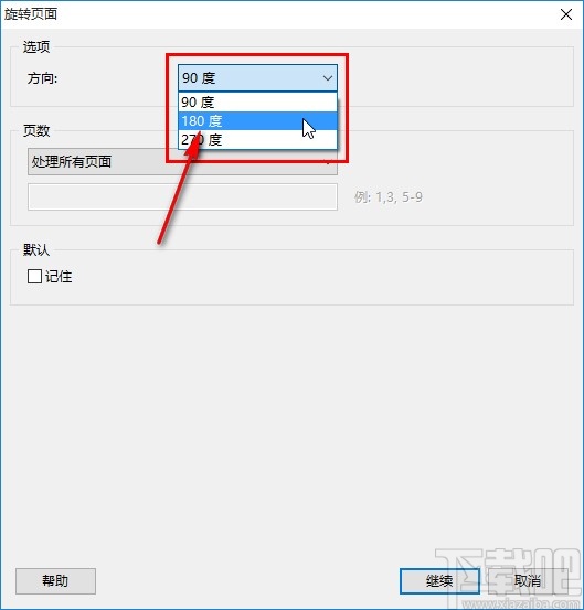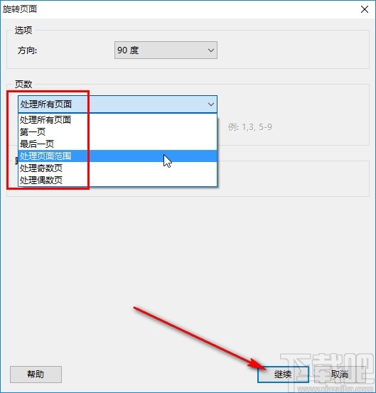 5.选择好旋转的角度之后,下一步我们找到页数模块的下拉列表,点击选择想要操作的页面范围,选择之后点击继续按钮。