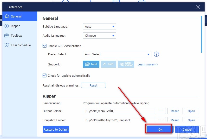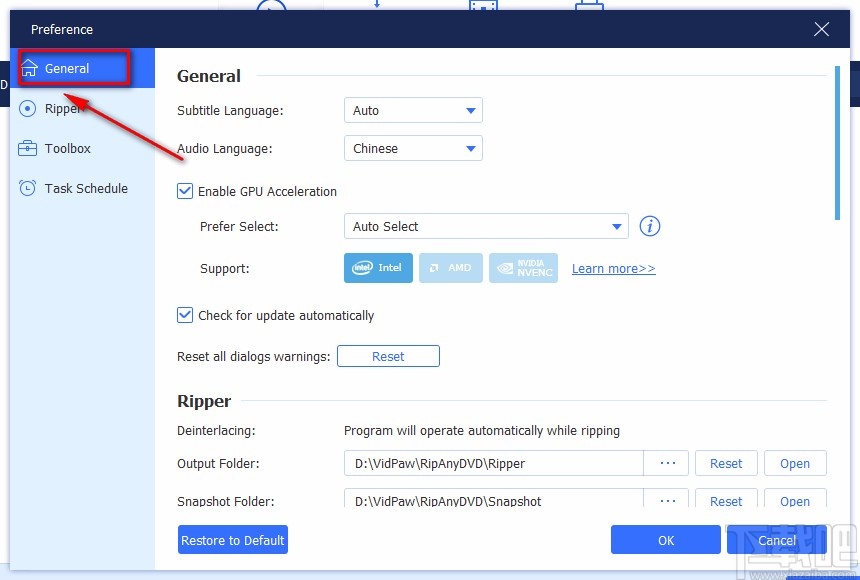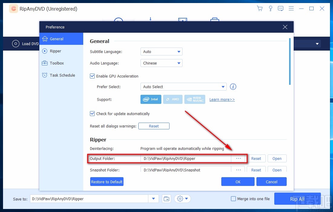 以上就是小编给大家整理的Vidpaw RipAnyDVD设置默认保存路径的具体操作方法,方法简单易懂,有需要的朋友可以看一看,希望这篇教程对大家有所帮助。