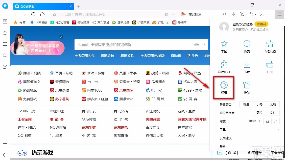 2.接着在三字图标下方会出现一个下拉框,我们在下拉框中找到“设置”选项,点击该选项即可。