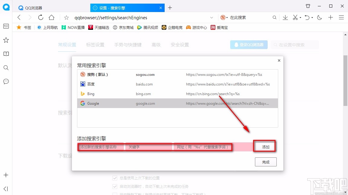 5.如果窗口中没有想要的搜索引擎,则可以在窗口下方输入搜索引擎名称、关键字或者网址,再点击窗口右下角的“添加”按钮就可以了。