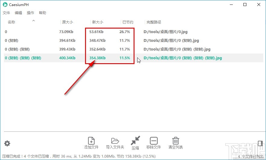 6.点击开始压缩之后,等待压缩操作完成,我们可以在界面中看到压缩文件的结果,压缩之后的新大小以及压缩节约的百分比,如下图中所示。