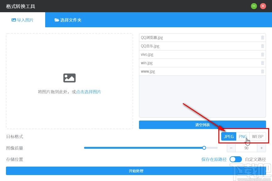 8.选择好转换图片的输出存储路径之后,最后一步我们点击界面中的开始处理这个功能按钮,点击之后即可立即开始转换图片格式。