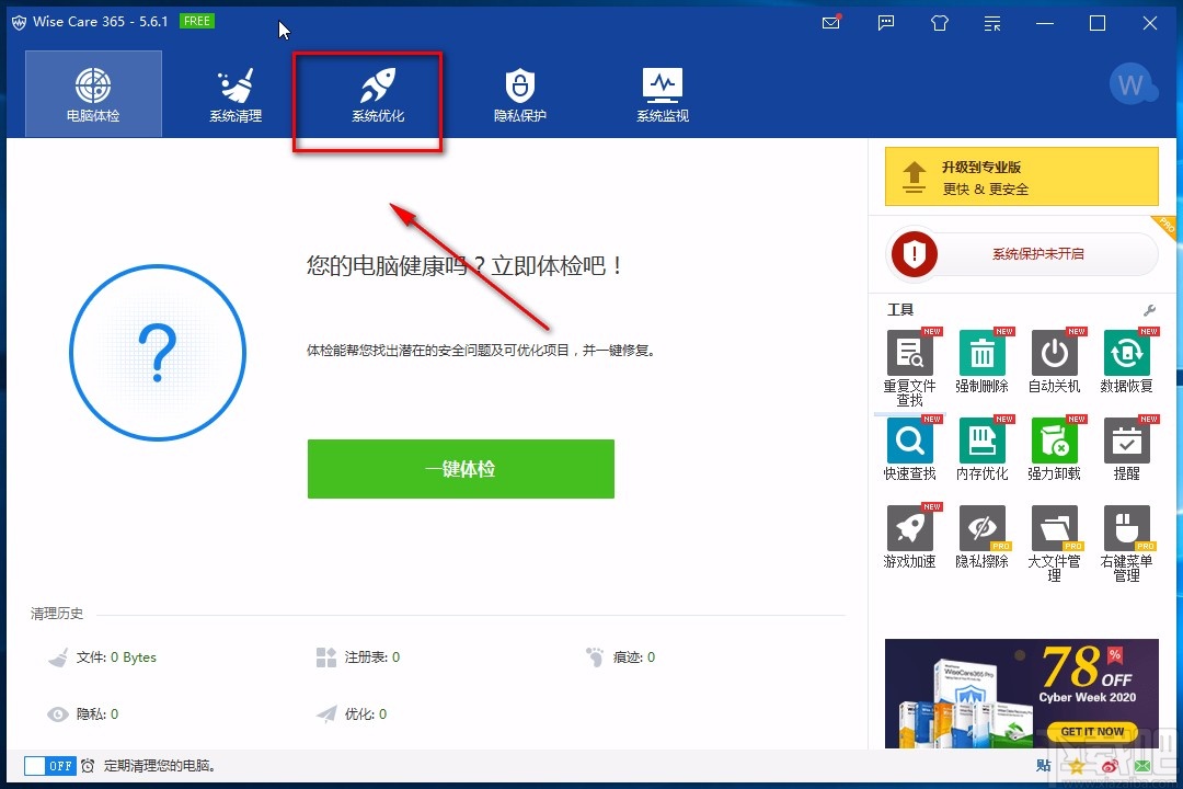 1.首先打开软件,我们在界面上方找到“系统优化”选项,点击该选项进入到系统优化页面。