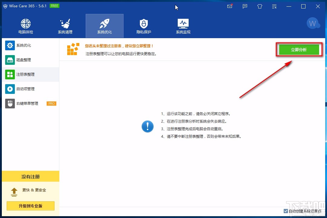 3.然后在注册表整理页面中,我们在页面右上角找到绿色的“立即分析”按钮,点击该按钮即可。