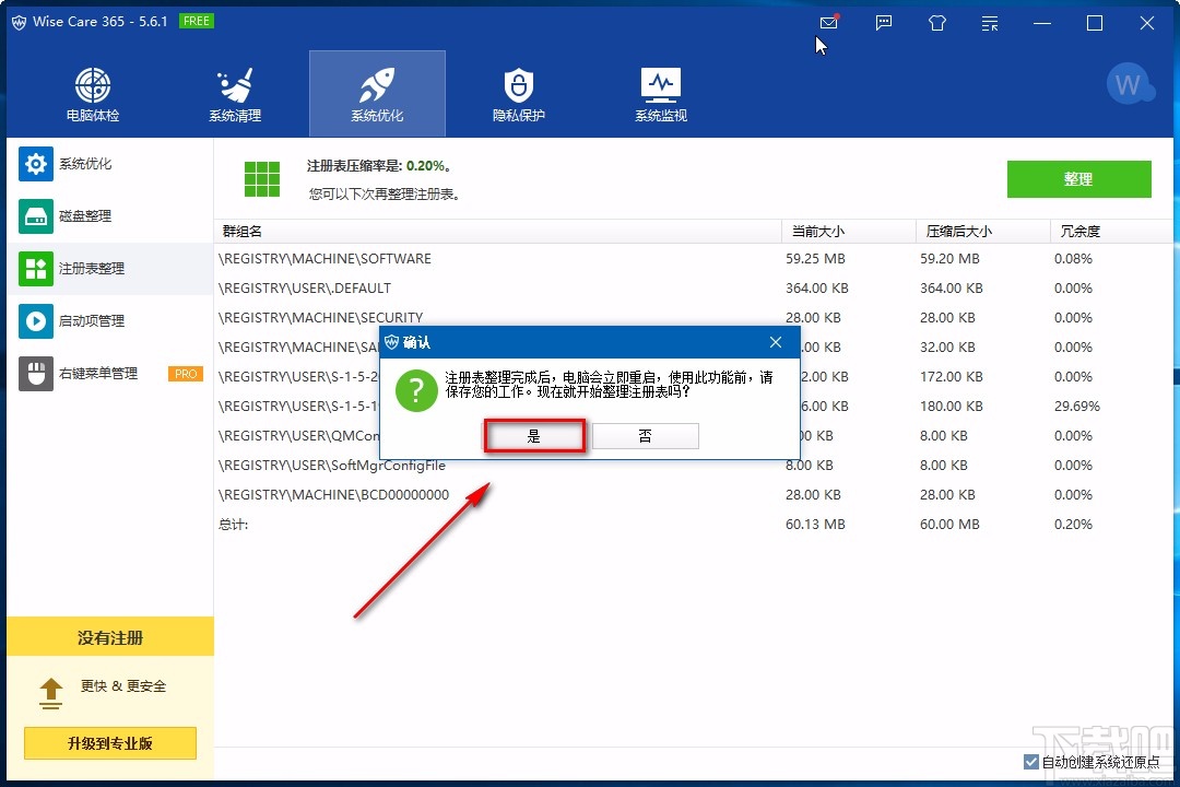 6.窗口中提示我们注册表整理完毕后,电脑会立即重启;这时候我们直接点击窗口中的“是”按钮,就可以成功整理注册表了。