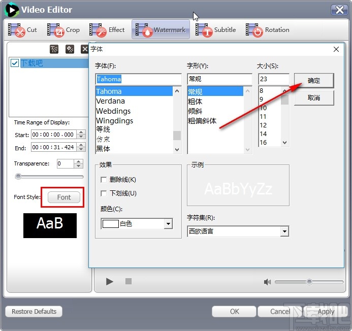 6.接下来在左边找到Font这个按钮之后,打开水印文字字体的设置界面,根据自己的需求在其中选择想要设置的水印字体、字号、颜色等,点击确定按钮保存。