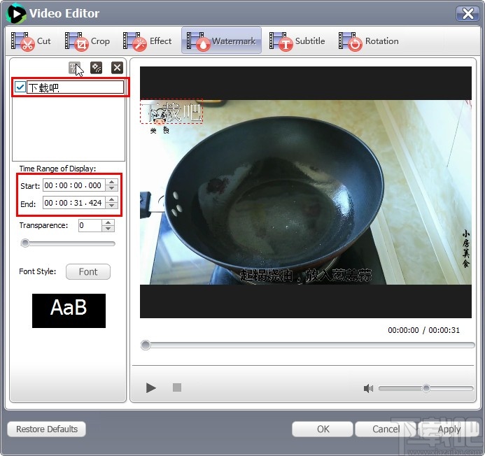 5.编辑好水印文字之后可以设置水印出现的时间段,在下图中框出的开始时间和结束时间位置进行设置即可。