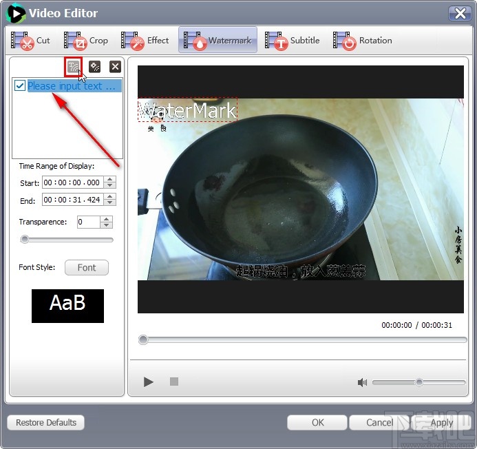 4.点击进入到水印设置界面之后,找到下图中框出的这个T字图标,点击可以添加一个水印文字,我们双击它可以编辑自己想要设置的水印文字。