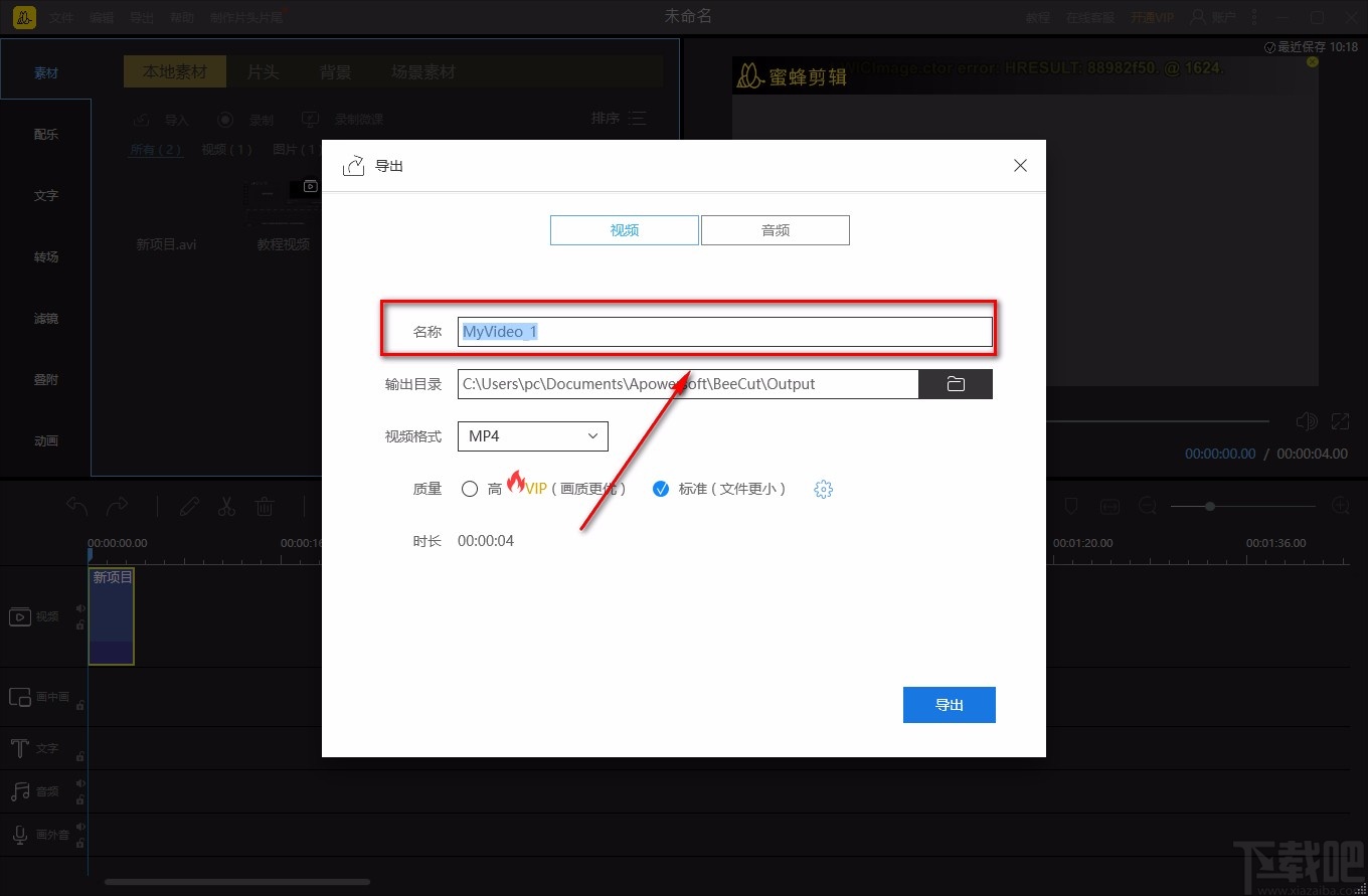 2.然后界面上就会弹出一个导出窗口,我们在窗口中找到“名称”选项,在该选项后面的文本框中输入视频名称。