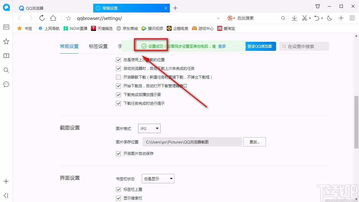 5.选择好图片格式后,我们在界面上方就可以看到“设置成功”的提示字样,如下图所示,这就表示成功设置好截图的图片格式了。