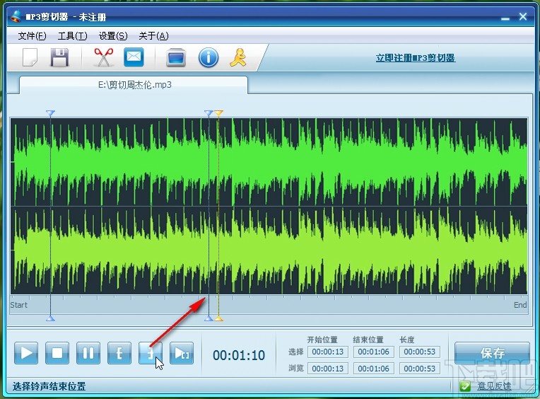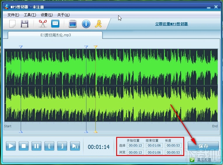 5.设置好这个剪切的结束位置之后,我们在界面右下角可以看到有剪切音频片段的开始位置和结束位置,点击右下角的保存按钮即可保存文件。