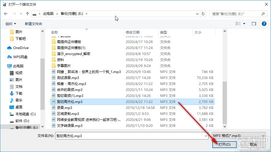 2.点击添加文件之后,下一步在出现的界面中我们选中目标MP3文件之后,点击右下角的打开按钮即可。