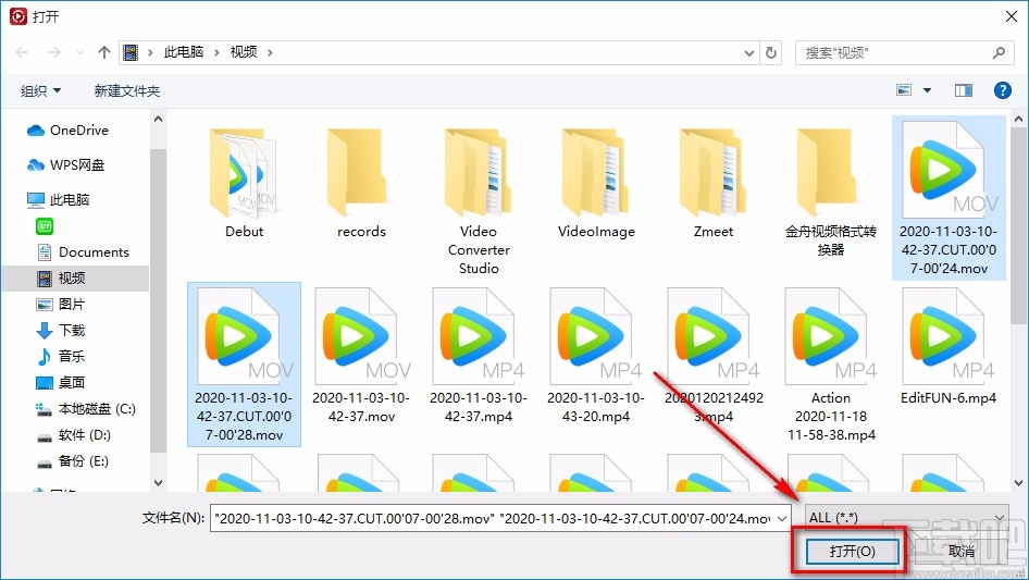 3.接着在文件添加页面中,我们选中需要合并的视频文件后,再点击页面右下角的“打开”按钮就可以了。