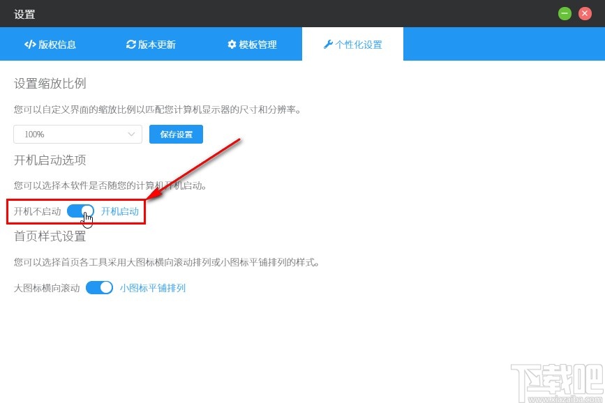 3.进入到这个个性化设置界面之后,我们找到开机启动这个选项,如下图中所示,此时“开机启动”显示为蓝色的字体,表示当前开启了开机启动功能。