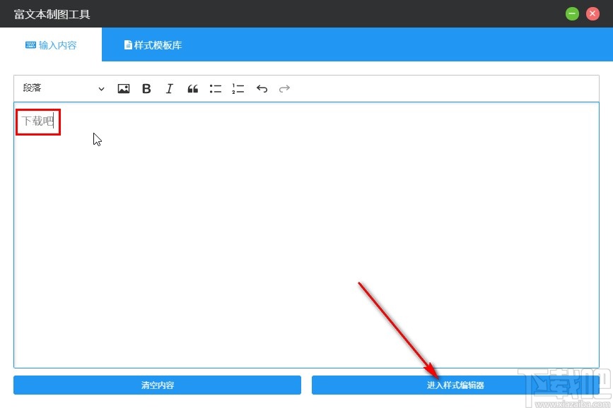 2.点击进入到富文本制图工具界面之后,我们在这个界面中找到文本编辑模块,在其中输入想要制作成图片的文本内容,然后点击右下角的进入样式编辑器按钮。