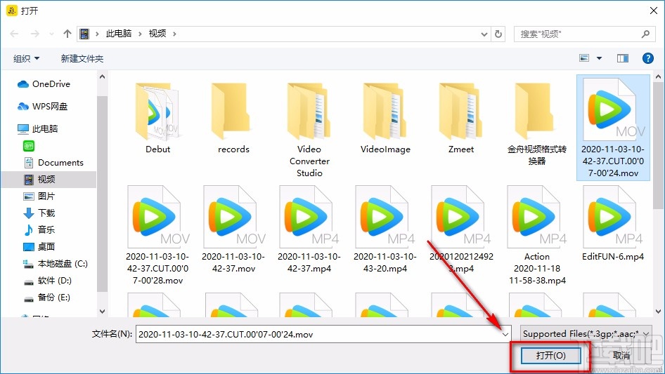 2.接着在文件添加页面中,我们选中需要进行分割操作的视频后,再点击页面右下角的“打开”按钮即可。