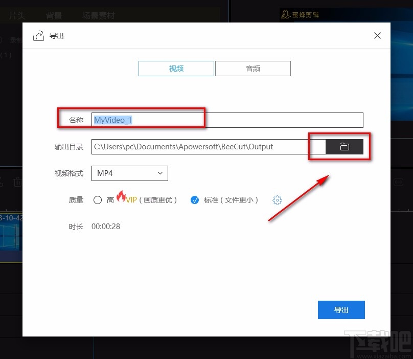6.随后界面上就会出现一个导出窗口,我们在“名称”文本框中输入文件名称,再点击界面右侧的文件打开按钮打开文件保存路径选择页面。