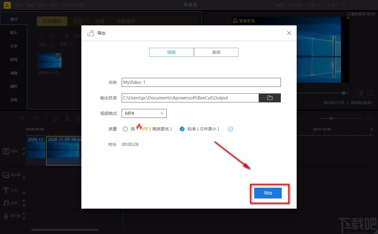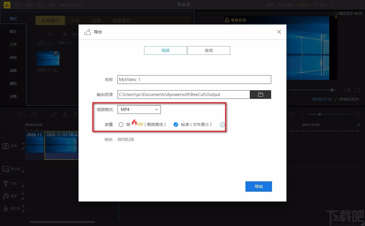 8.接下来在导出窗口中找到“视频格式”以及“质量”选项,我们根据自己的需要对两个参数进行设置即可。