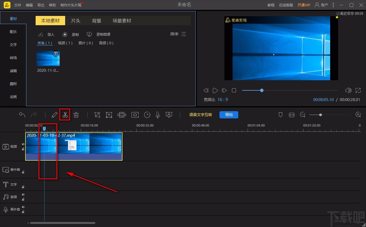 4.然后我们在时间轨道的左侧可以看到一个蓝色的小光标,我们向右移动这个光标,使其到视频分割的位置,并点击时间轨道上方的剪刀按钮。