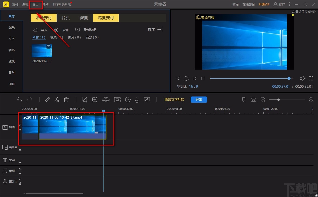 5.完成上一步后,我们就成功分割视频了,如下图所示;这时候选中需要的视频片段,再点击界面左上方的“导出”按钮即可。