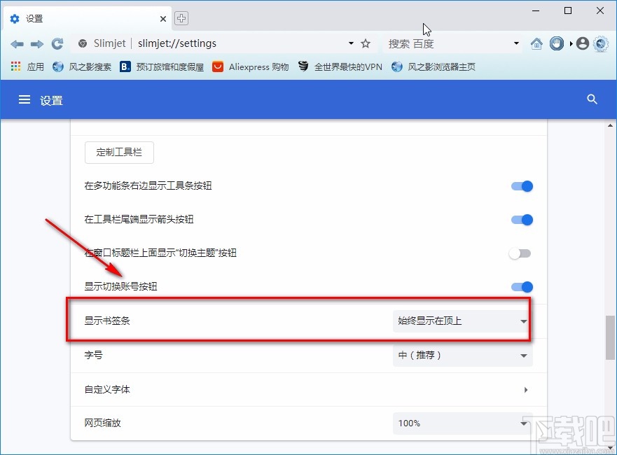 4.然后就会进入到设置页面,我们向下滑动鼠标,同时在界面上找到“显示书签条”选项,如下图所示。