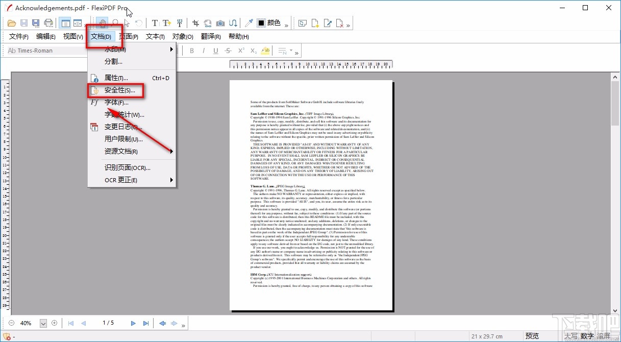 2.接着在界面上方找到“文档”选项并点击,其下方会出现一个下拉框,我们在下拉框中选择“安全性”选项。