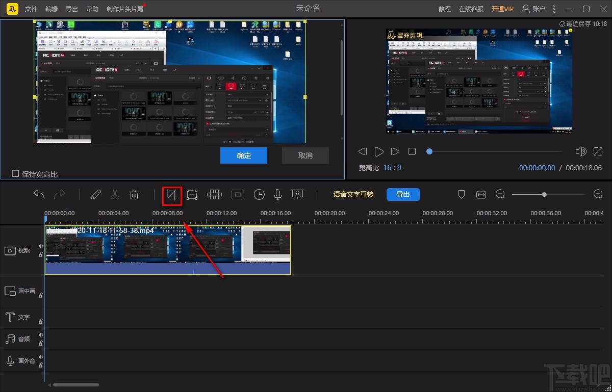4.然后在时间线上选中视频,再点击时间线上方的裁剪按钮,界面左上方就会出现一个裁剪窗口。