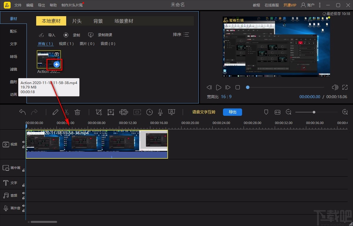 3.将视频文件添加到软件后,我们将鼠标移动到视频上,视频右下角会出现一个加号图标,点击该图标就可以将视频添加到下方的时间线上。