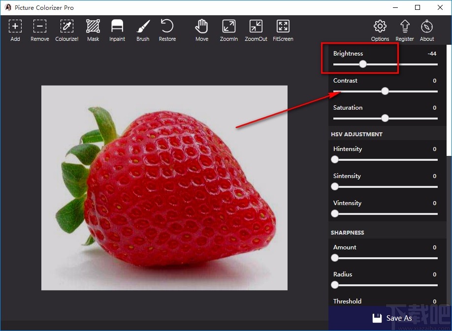 4.比如小编向左拖动小圆光标,在界面上就可以看到图片明显变暗了;调整好图片亮度后,我们在界面右下角找到“Save As”按钮并点击即可。