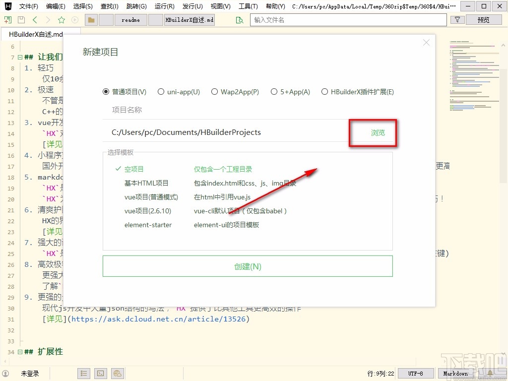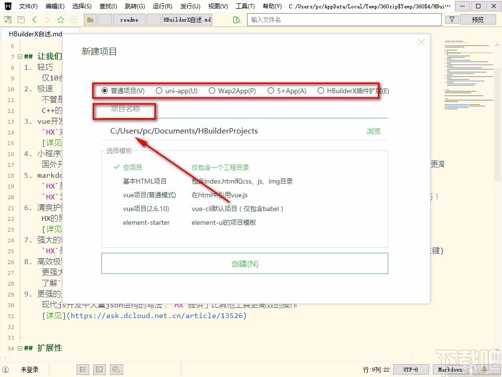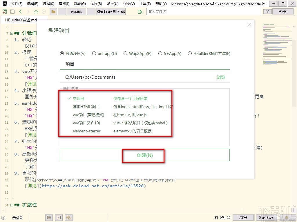 6.完成以上所有步骤后,我们在窗口中选择项目模板,再点击窗口底部的“创建”按钮就可以了。