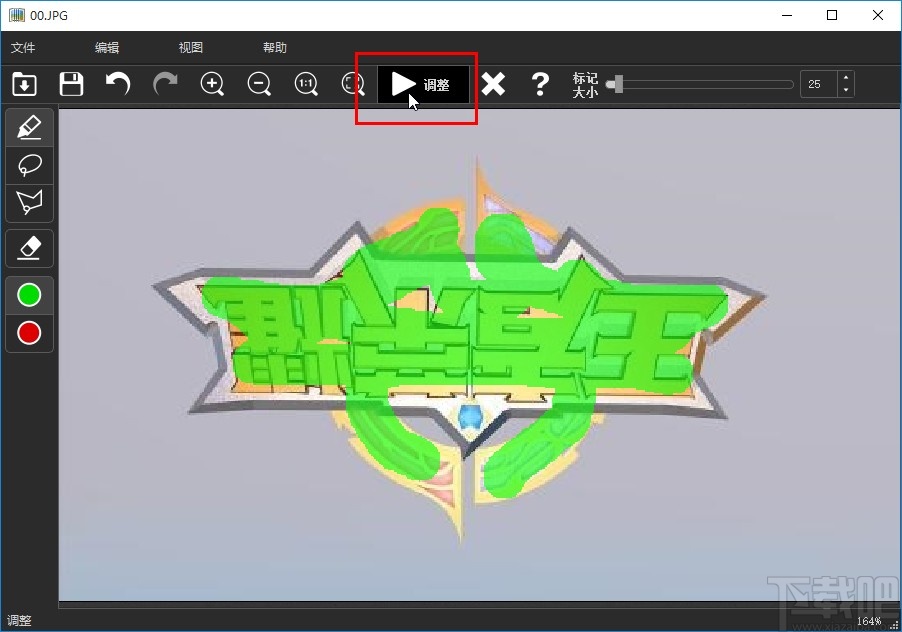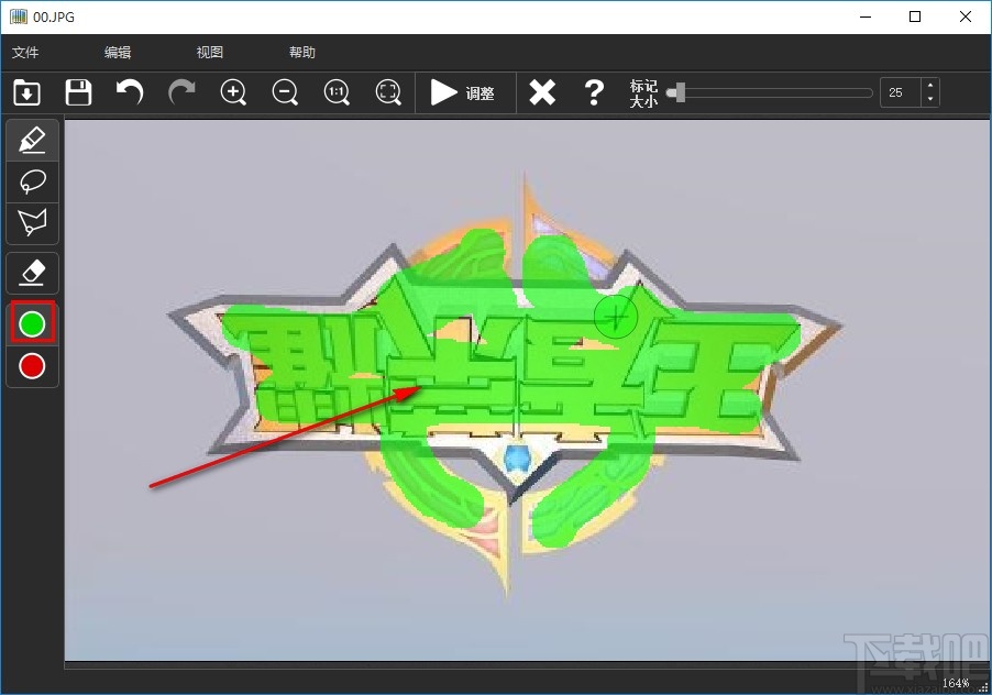 3.点击这个打开按钮之后,在界面左边找到绿色的功能图标之后,点击选中它,然后将图片界面中重要的,需要在缩小后保留的图片部分涂成绿色,如下图中所示,这样图片缩小后不会损坏这个部分。