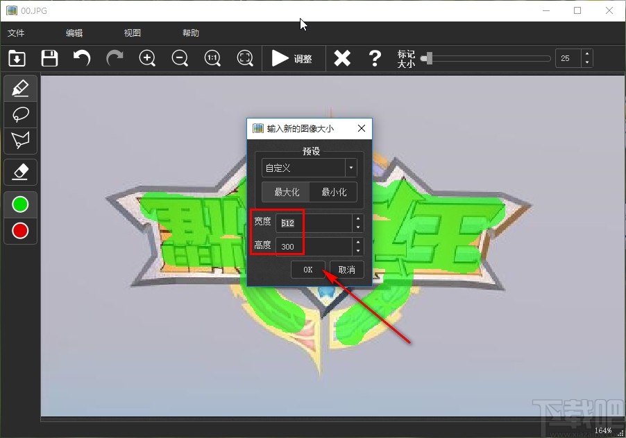 5.点击调整之后出现一个设置调整参数的窗口,我们在这个窗口中选择自定义之后,根据自己想要调整的大小来设置宽度、高度,然后点击OK按钮即可开始调整。