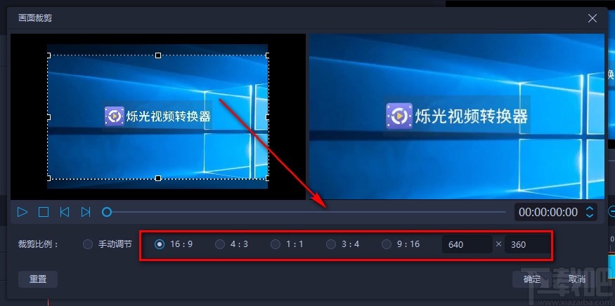7.在画面裁剪页面下方还可以看到很多裁剪比例,根据自己的需要进行选择就可以了;也可以在“裁剪比例”选项后面的文本框中输入裁剪比例;画面裁剪结束后,在页面右侧的视频预览窗口中就可以看到裁剪效果;再点击页面右下角的“确定”按钮,就可以返回到主界面。