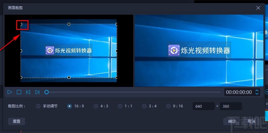 6.随后界面上会出现一个画面裁剪页面,我们在页面左侧的视频预览窗口中可以看到一个裁剪框,点击裁剪框边上的小方框就可以调整裁剪框的大小。