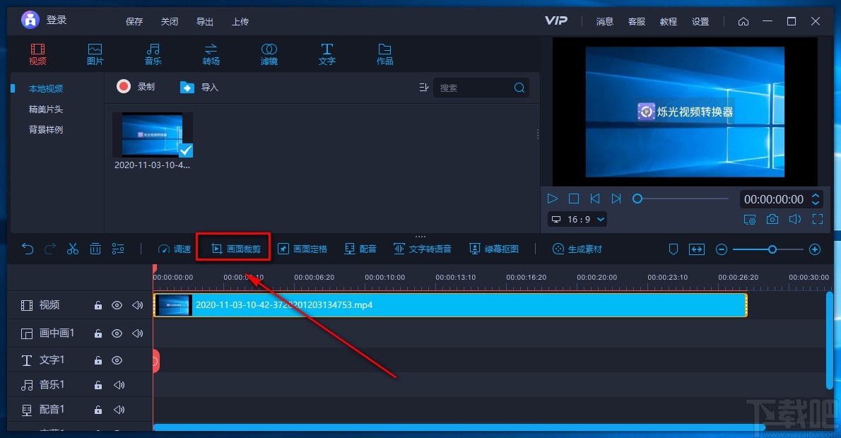 5.然后在时间轨道的上方找到“画面裁剪”按钮,点击该按钮就可以开始进行裁剪画面的操作。