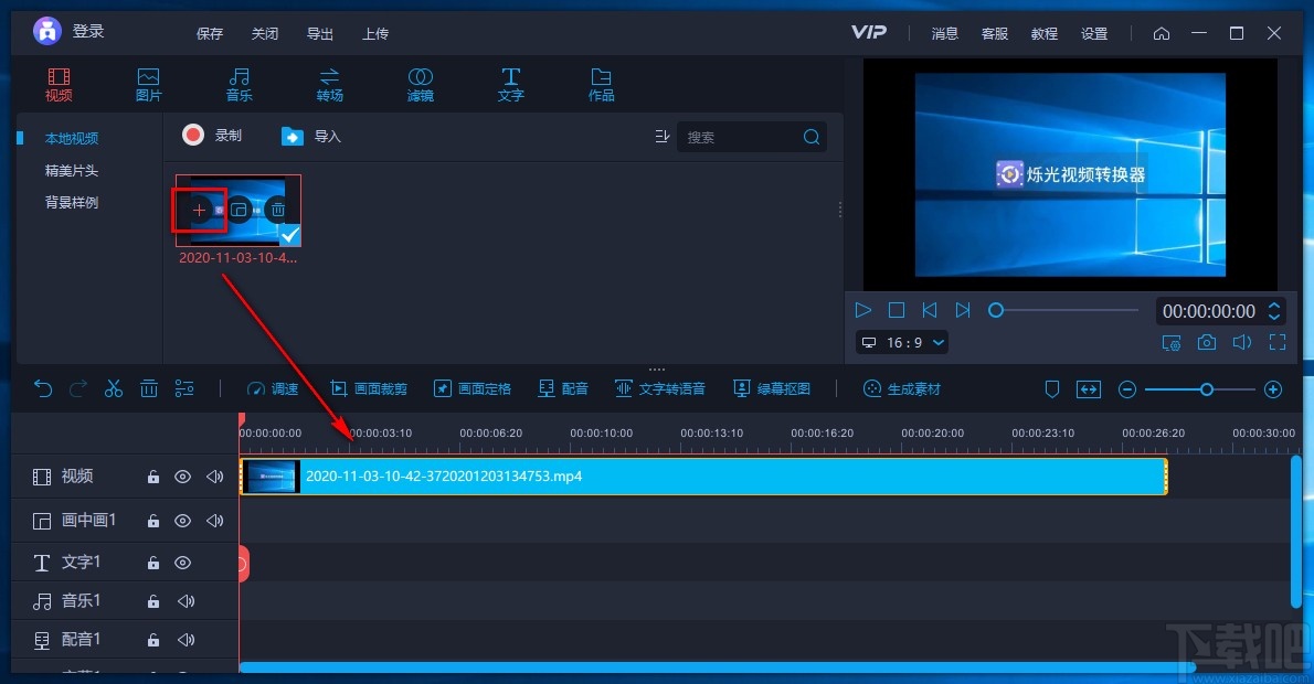 4.将视频添加到软件后,我们将鼠标移动到视频上,视频上会出现一个加号图标,点击该图标就可以将其添加到下方的时间轨道上。