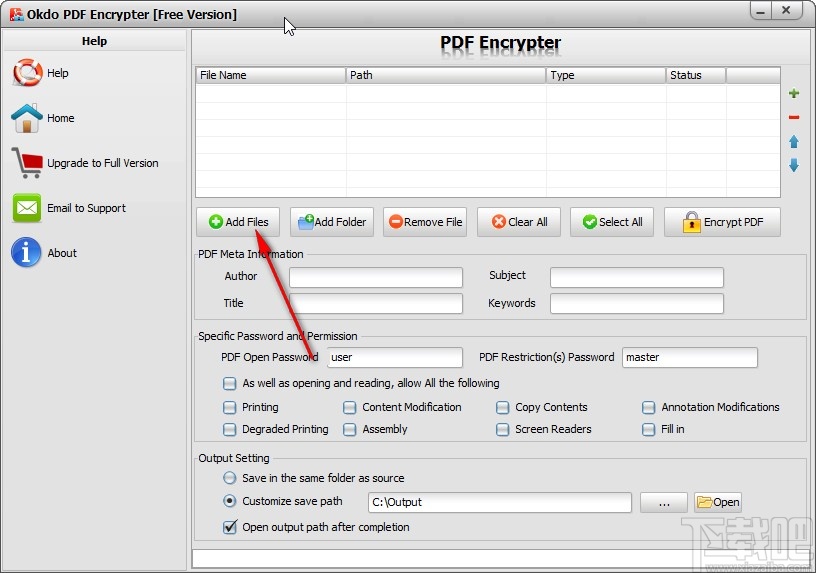 1.首先第一步我们打开软件之后,在界面中找到Add Files这个添加文件按钮,点击之后添加想要加密的PDF文件。