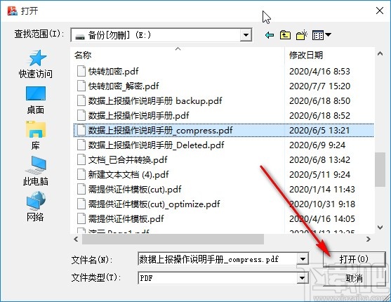 2.点击这个添加按钮之后,打开一个选择文件的界面,在界面中选中PDF文件之后点击右下角的打开按钮。