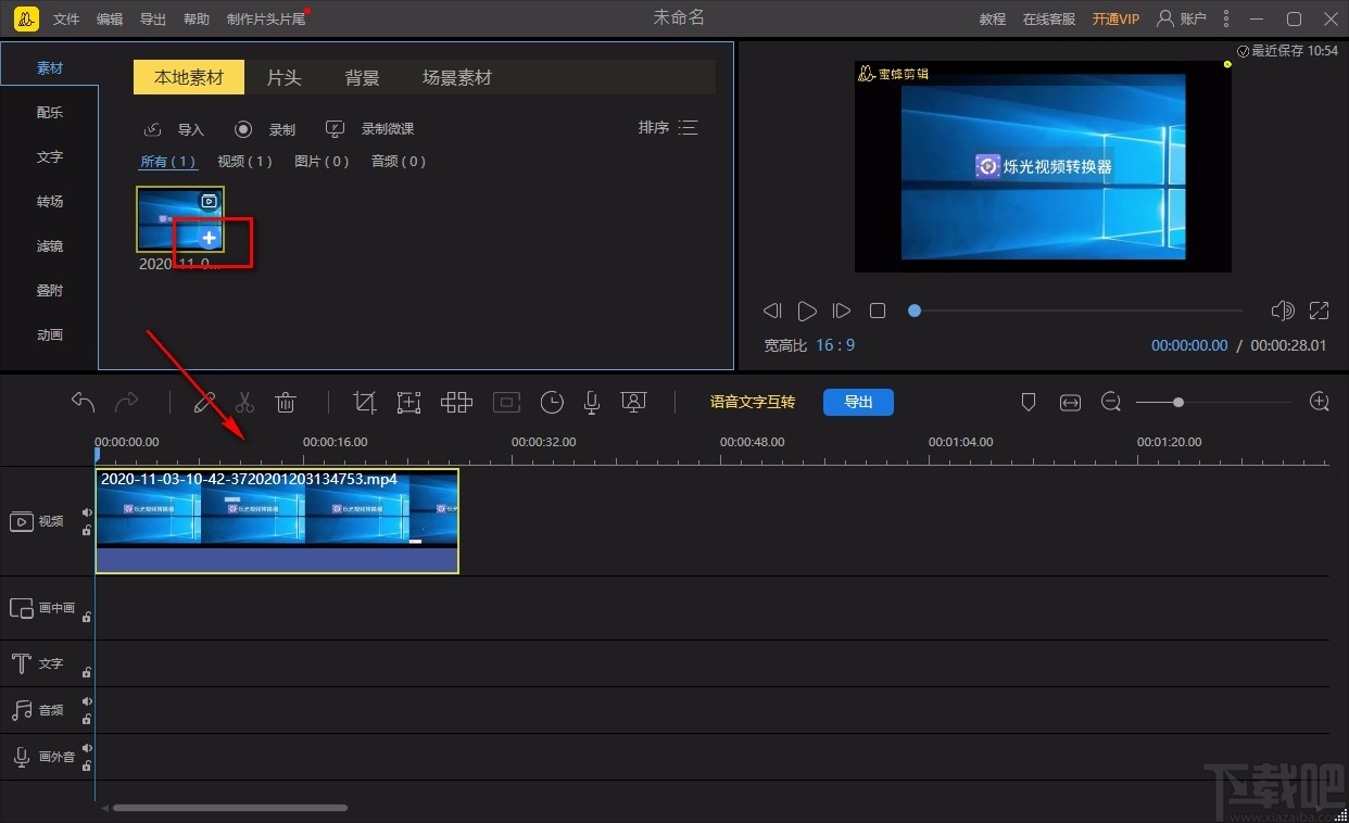 3.将视频添加到软件后,我们将鼠标移动到视频上,视频上会出现一个加号图标,点击该图标就可以将视频添加到时间线上。