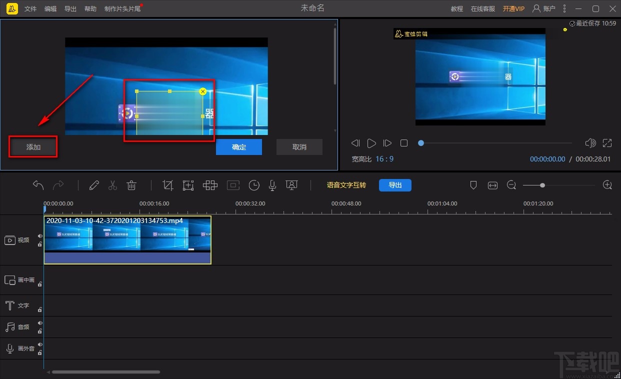 5.在添加马赛克窗口中,我们在窗口左下角点击“添加”按钮,视频上就会出现一个马赛克,如下图所示。