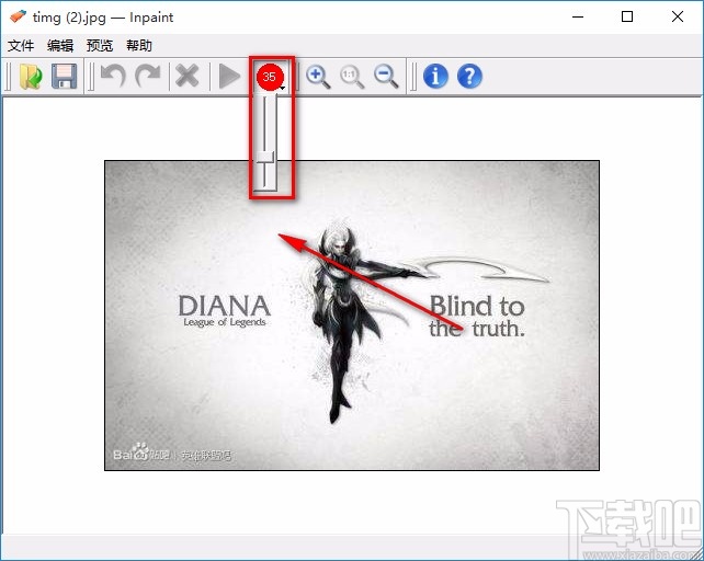 3.将图片在软件中打开后,我们在界面上方找到下图所示的记号大小按钮,点击该按钮,其下方会出现一个标尺;我们拖动标尺上的小光标来调整水印记号的大小。