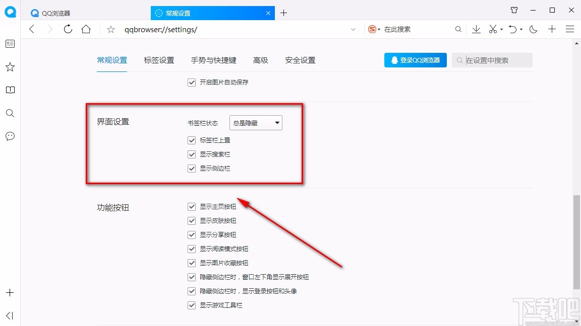 4.然后就可以进入到设置页面,我们在页面上找到“界面设置”选项,该选项后面有一个“书签栏状态”选项。