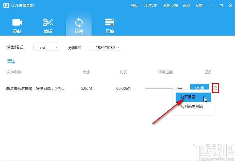 6.等到转换完成之后在操作模块点击三点按钮图标,点击之后可以在出现的菜单列表中找到打开目录这个选项,点击即可进入到查看转换视频的文件夹。