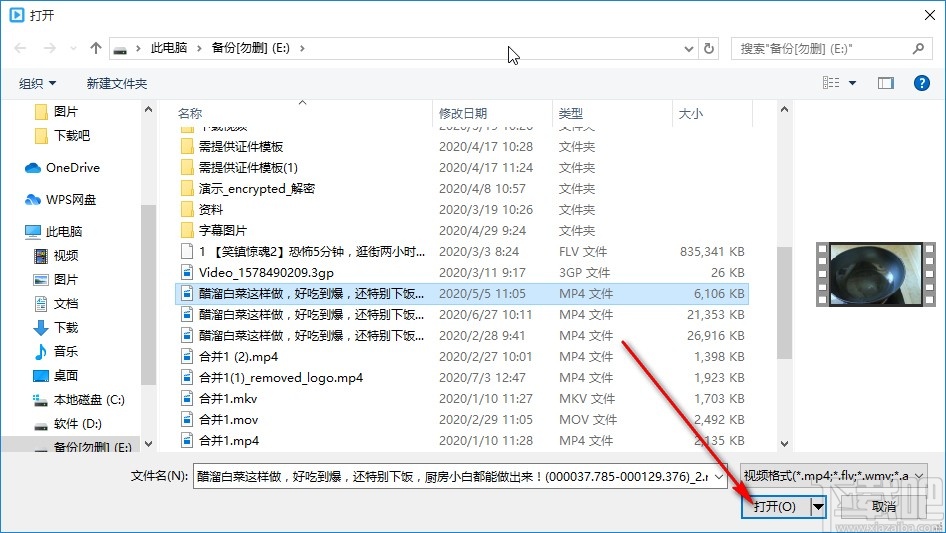 2.点击这个添加文件图标之后,接下来在打开的选择文件界面中,我们选中想要转换的视频文件之后点击右下角的打开按钮。