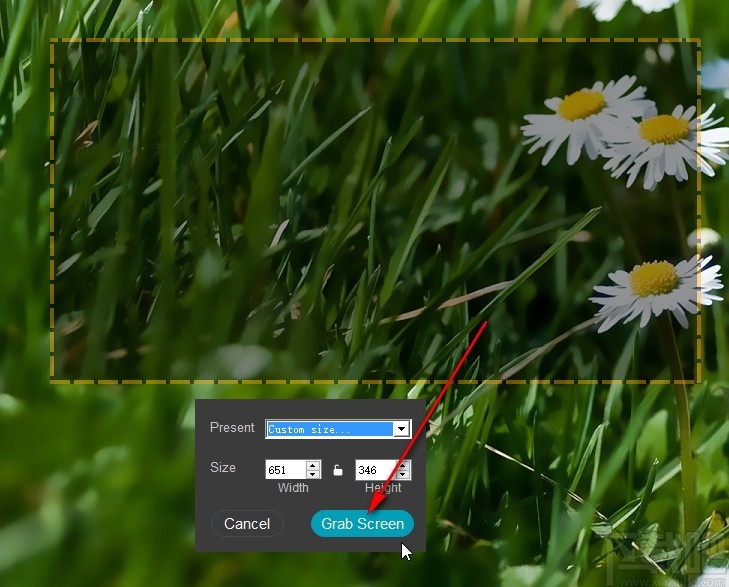 7.选择这个截图方式之后,在界面中框选想要截图的大小,然后找到桌面中的截图操作面板,可以看到选择的区域大小,点击Grab Screen按钮即可确定截图。