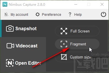 3.将截图保存下来之后找到fragment这个选项,点击之后即可使用片段截取的方式,也就是截取屏幕中固定大小的片段。