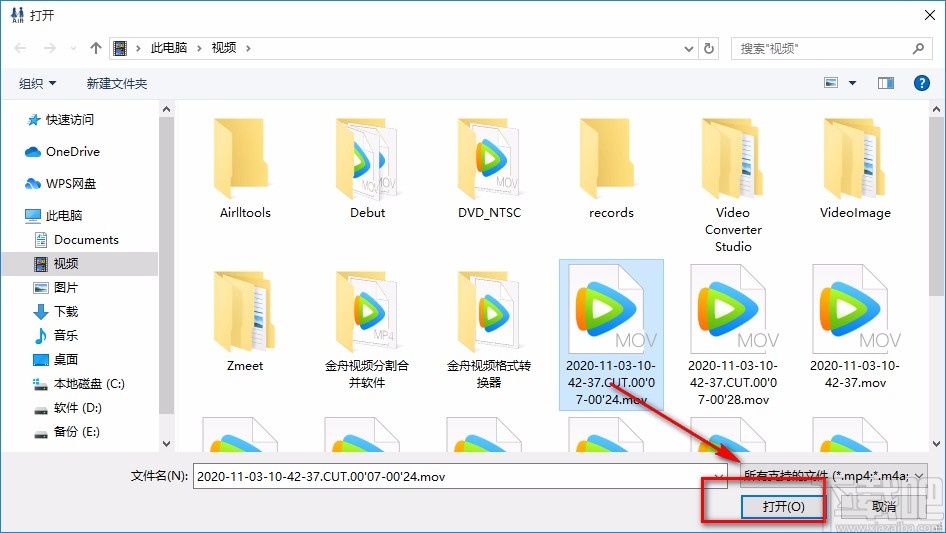 3.在文件添加页面中,我们选中需要分割的视频文件后,再点击页面右下角的“打开”按钮即可。